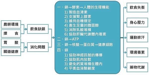 1. 健康腸道+能夠運送鎂的蛋白質分子+適當的副甲狀腺荷爾蒙+水分吸收的比例 → 鎂的吸收程度