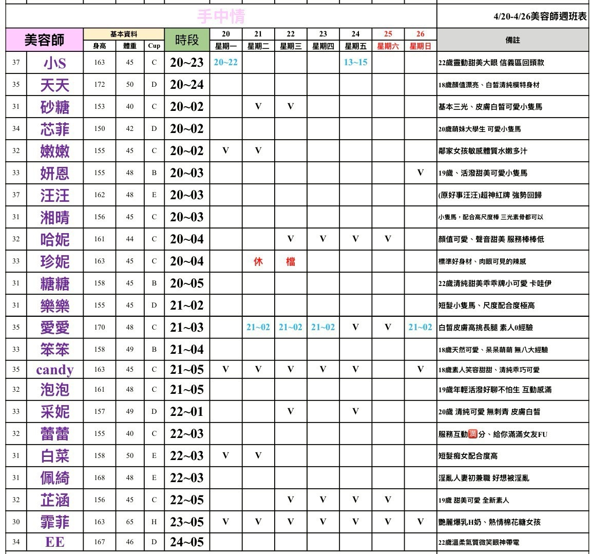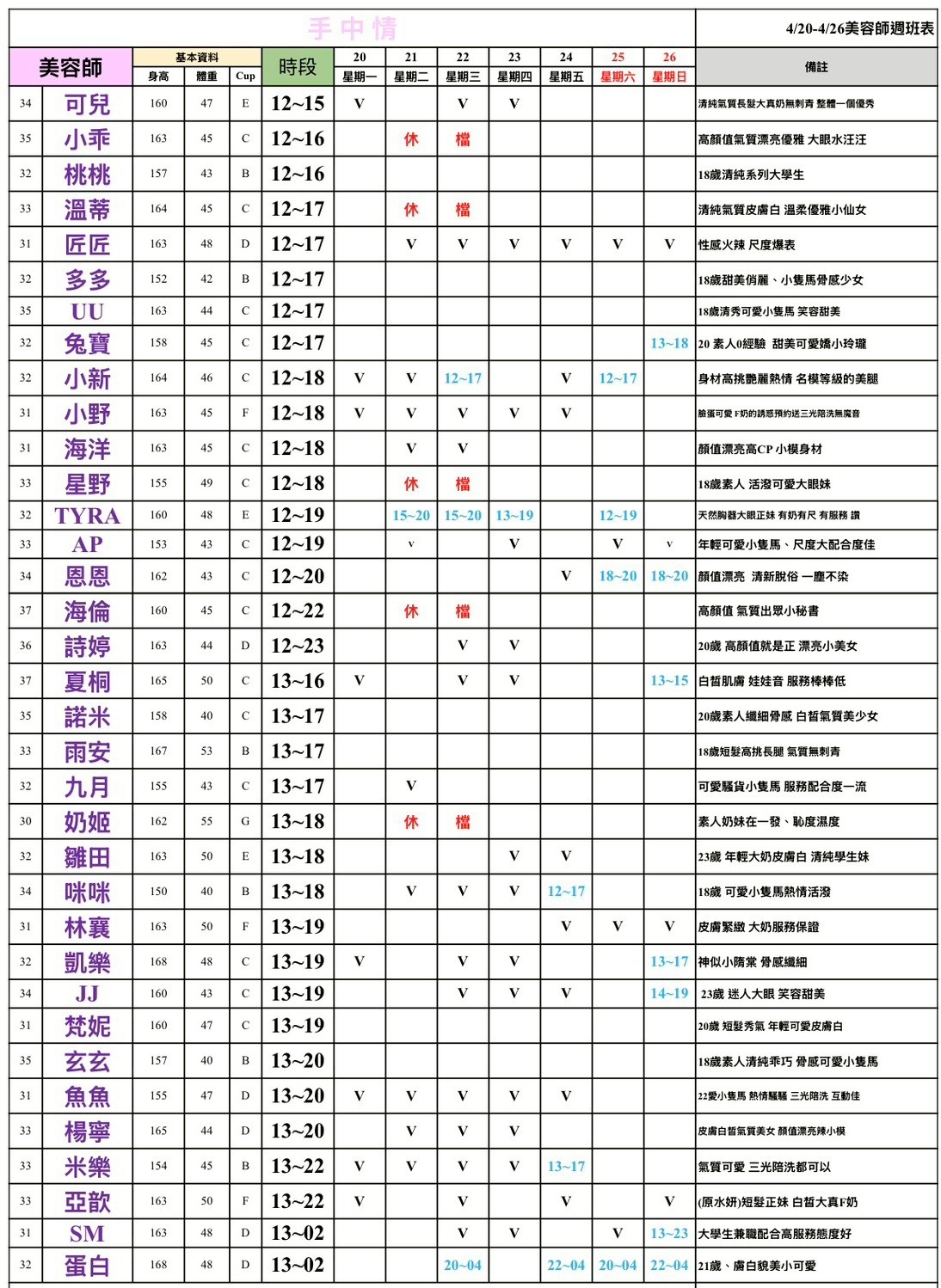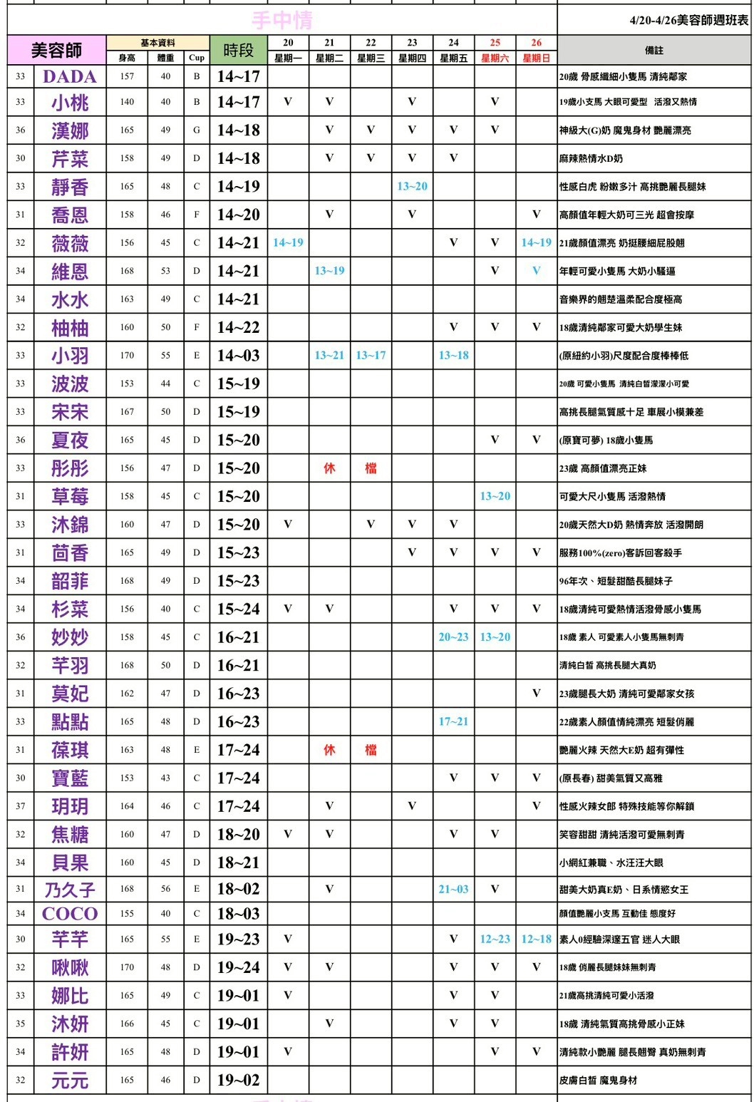 預約須知 ①手機包包要鎖置物櫃 ②小艾團隊全年無休,每日早上10:00至隔天早上7:00都可以 為您服務&預約 ③消費方式: 本館客單已包含包廂費 基本消費2900起 部分紅牌3000起 ④班表上的末班並非下班 歡迎加我詢問: 點我點我 小愛/小艾 團隊精選--請點擊我 為您規劃路線 -- 請點擊我 附近停車場 --168停車聯盟 合發大樓停車場 ❤❤❤❤❤❤❤❤❤❤ 其他館別班表連結: 林森班表 愛寶班表 錦州班表 大都會班表 芯苑班表 永利館班表 雙城館班表 樂鑽班表 長春班表 夏葳夷班表