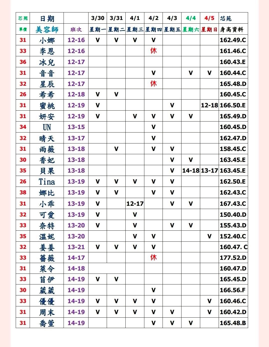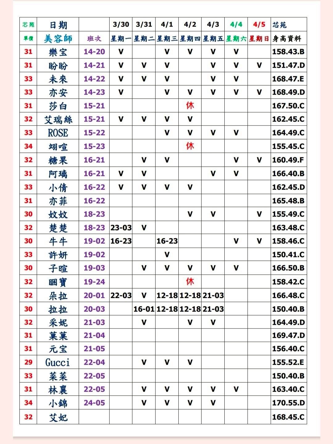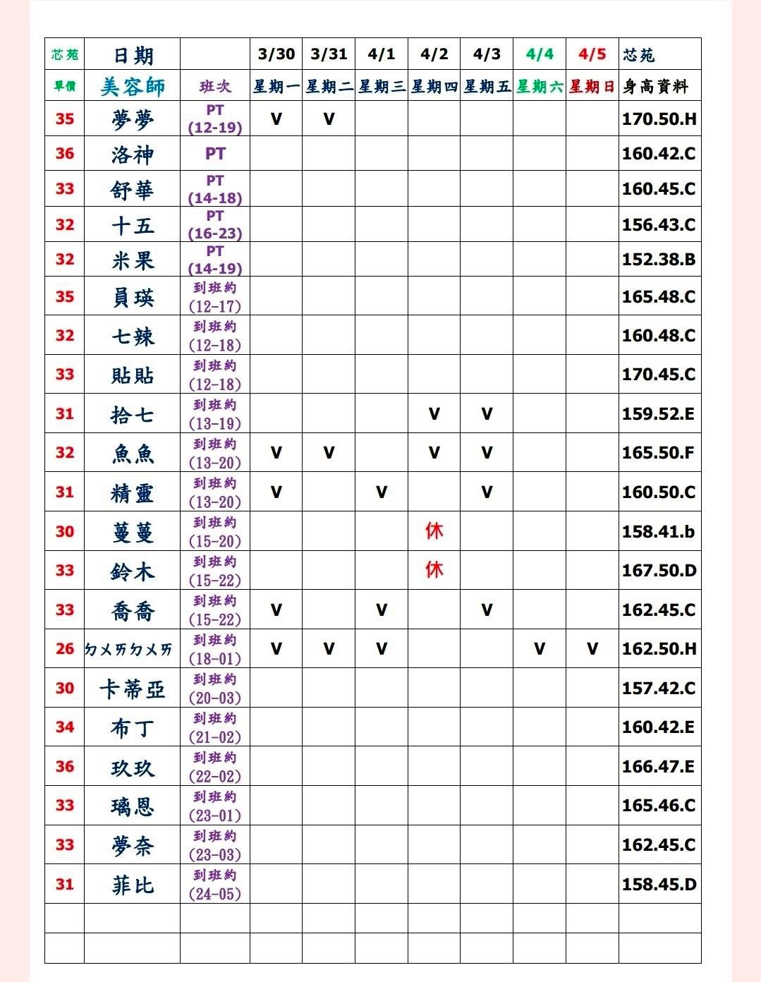 預約須知: ①手機包包要鎖置物櫃 ②小艾團隊全年無休,每日早上10:00至隔天早上7:00都可以 為您服務&預約 ③消費方式: 本館需加收100NT包廂費 基本消費2900起 部分紅牌3000起 ④班表上的末班並非下班 歡迎加我詢問: 點我點我 小愛/小艾 團隊精選 --請點擊我 為您規劃路線--請點擊我 附近停車場 -- 欣欣百貨停車場 台灣聯通停車場-華泰王子場 ❤❤❤❤❤❤❤❤❤❤ 其他館別班表連結: 林森班表 愛寶班表 錦州班表 大都會班表 芯苑班表 永利館班表 雙城館班表 樂鑽班表 長春班表 夏葳夷班表