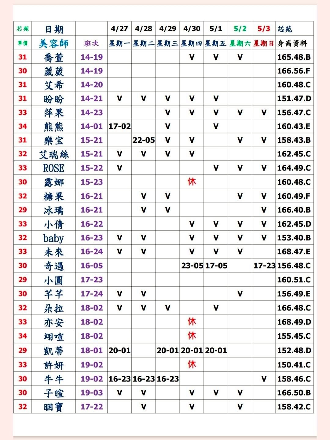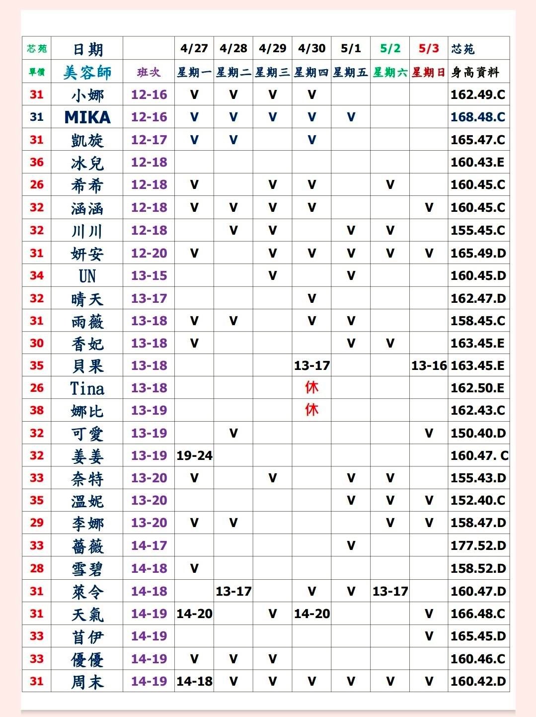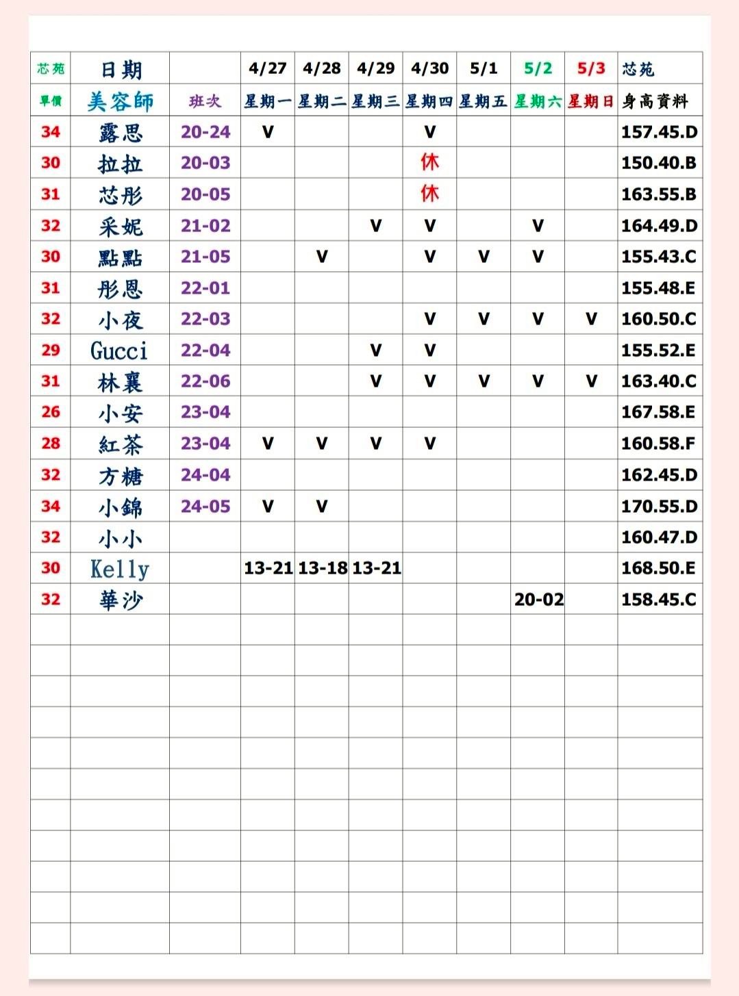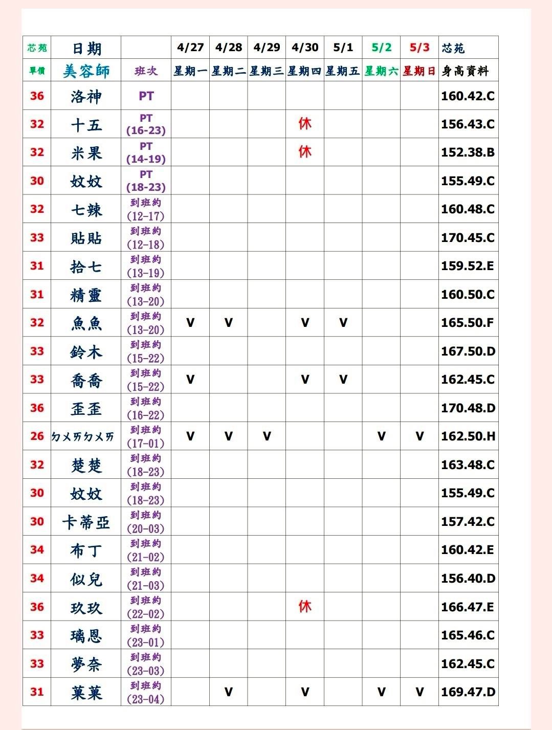 預約須知: ①手機包包要鎖置物櫃 ②小艾團隊全年無休,每日早上10:00至隔天早上7:00都可以 為您服務&預約 ③消費方式: 本館需加收100NT包廂費 基本消費2900起 部分紅牌3000起 ④班表上的末班並非下班 歡迎加我詢問: 點我點我 小愛/小艾 團隊精選 --請點擊我 為您規劃路線--請點擊我 附近停車場 -- 欣欣百貨停車場 台灣聯通停車場-華泰王子場 ❤❤❤❤❤❤❤❤❤❤ 其他館別班表連結: 林森班表 愛寶班表 錦州班表 大都會班表 芯苑班表 永利館班表 雙城館班表 樂鑽班表 長春班表 夏葳夷班表